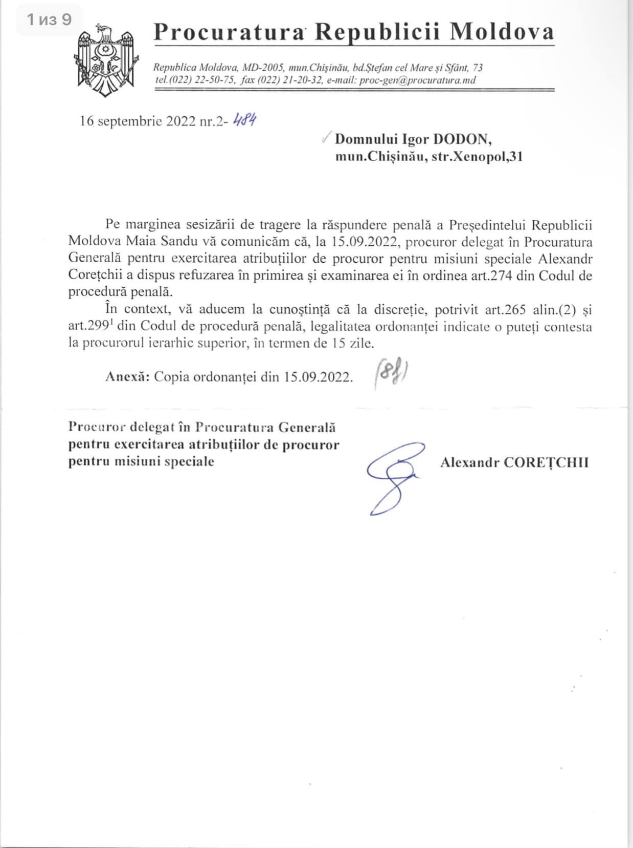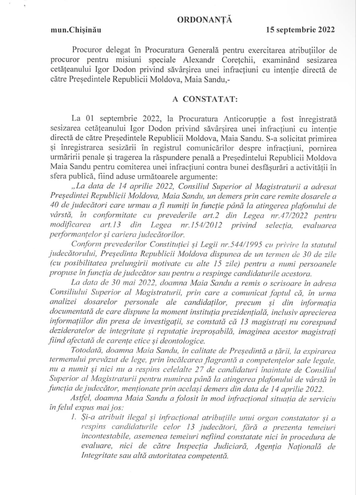 După cum v-am anunțat, la data de 1 septembrie 2022 am remis în adresa doamnei Procuror anticorupție, Veronica Drăgălin, o sesizare privind săvârşirea de către Preşedintele Republicii Maia Sandu a unei infracţiuni. Neglijând atribuțiile sale funcționale și prevederile legale în privința nenumirii judecătorilor în funcție, în dorința de a intimida și subordona judecătorii, Maia Sandu, prin acțiunile sale, a cauzat un prejudiciu patrimonial bugetului de stat în valoare de 2,5 milioane de lei, precum și un prejudiciu imens drepturilor şi intereselor ocrotite de lege ale persoanelor fizice sau juridice care au calitatea de justiţiabili.