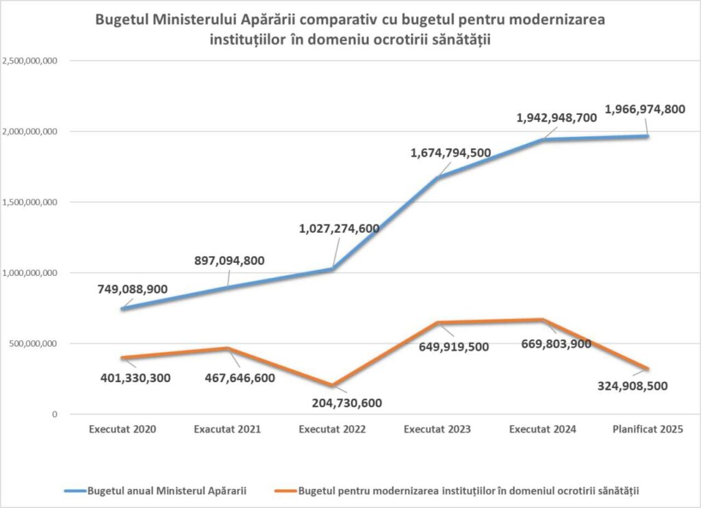 Mai jos este prezentat un grafic care arată clar: în ultimii ani, bugetul Ministerului Apărării a crescut de câteva ori, în timp ce finanțarea domeniilor sociale a rămas la același nivel sau chiar s-a redus.