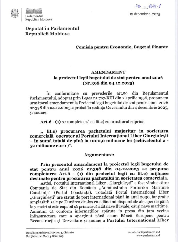 Împreună cu colegii am înregistrat un amendament privind reîntoarcerea Portului Internațional Liber Giurgiulești în proprietatea statului