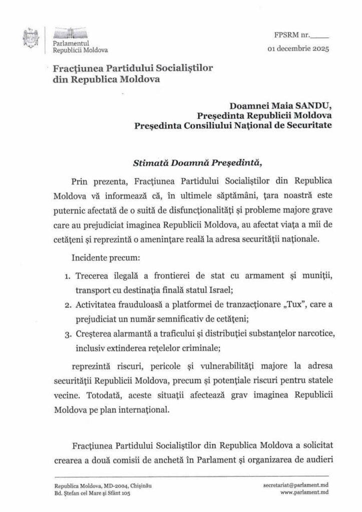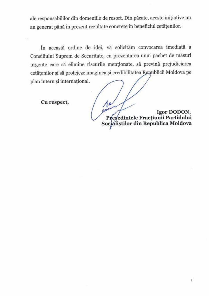 Solicităm de la președinta Maia Sandu convocarea imediată a Consiliului Suprem de Securitate, din motiv că evenimentele din ultima perioadă arată că Republica Moldova se confruntă cu probleme serioase de insecuritate internă: trafic de arme și droguri, sporirea alarmantă a criminalității organizate, alte tipuri de infracțiuni și abateri care pun în pericol viața cetățenilor și au devenit cronice în ultimii ani.