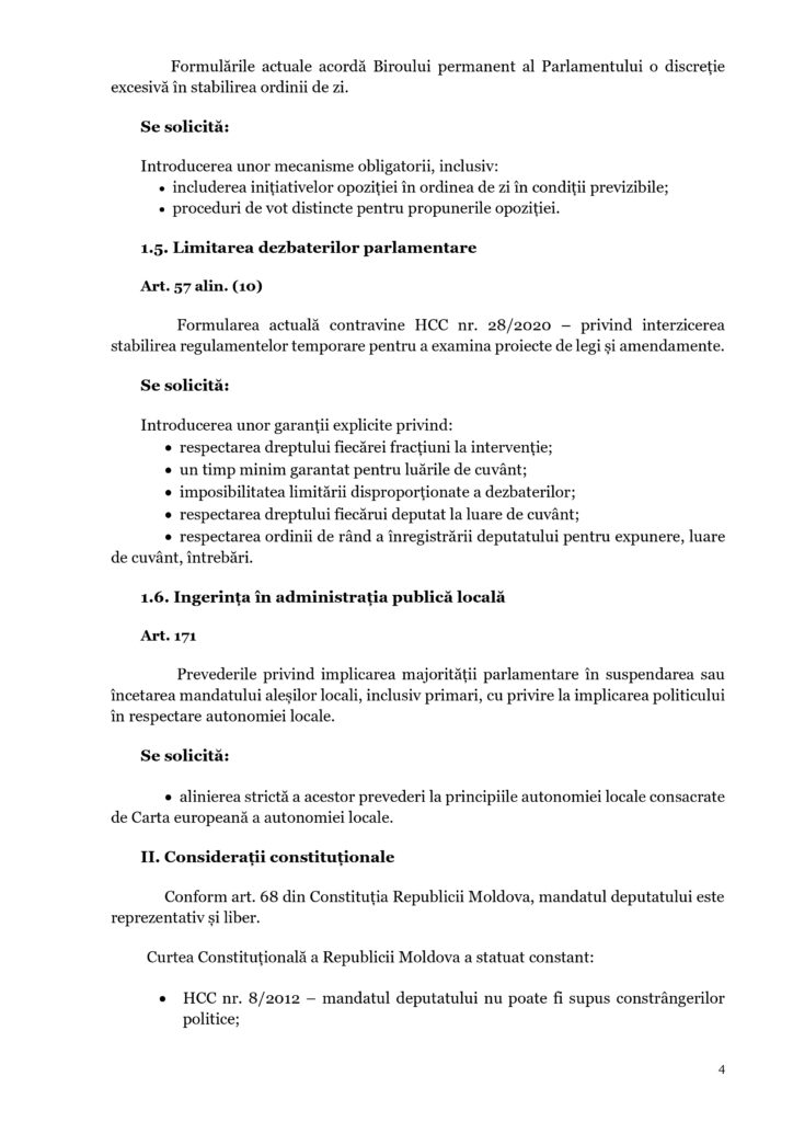 Considerăm că aceste inițiative permit modificarea regulilor fără participarea opoziției, limitează drepturile deputaților și contravin Constituției și standardelor europene.