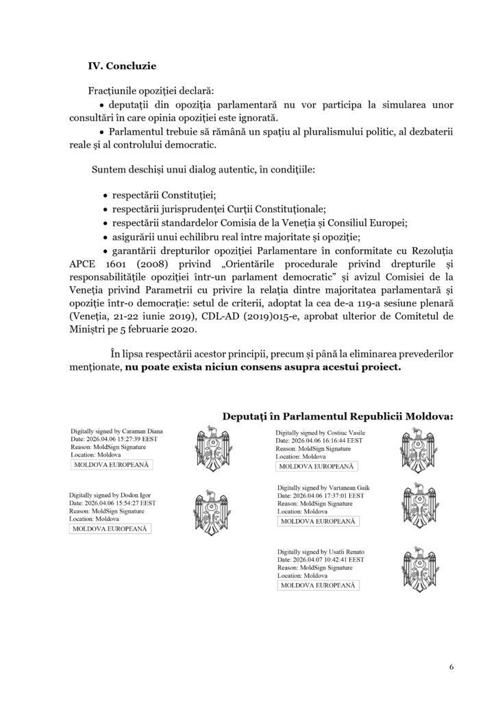Astăzi, liderii fracțiunilor de opoziție din Parlamentul Republicii Moldova au transmis o adresare comună Secretarului General al Consiliului Europei, președintelui Comisiei de la Veneția și șefului Delegației Uniunii Europene în Republica Moldova, în legătură cu inițierea de către partidul de guvernare PAS a unor modificări ale cadrului legal care reglementează statutul și conduita deputatului, precum și legislația privind organizarea și funcționarea Parlamentului Republicii Moldova.