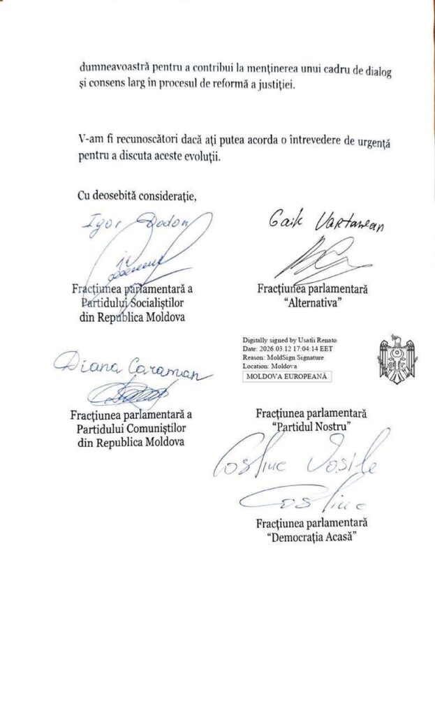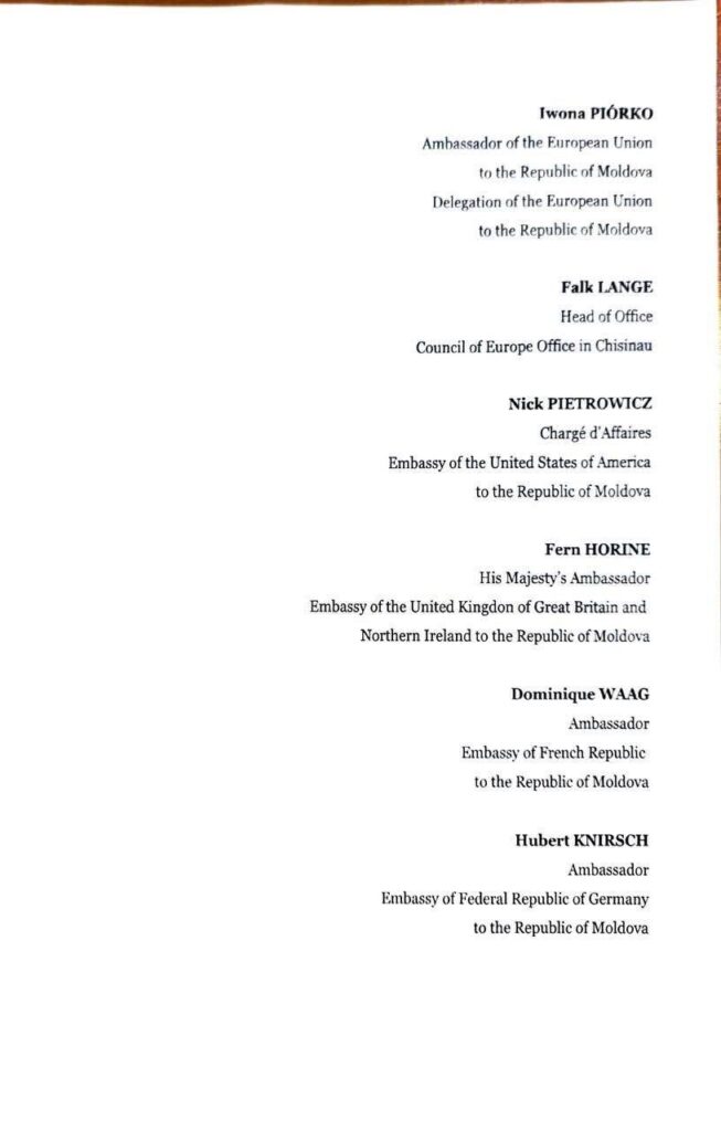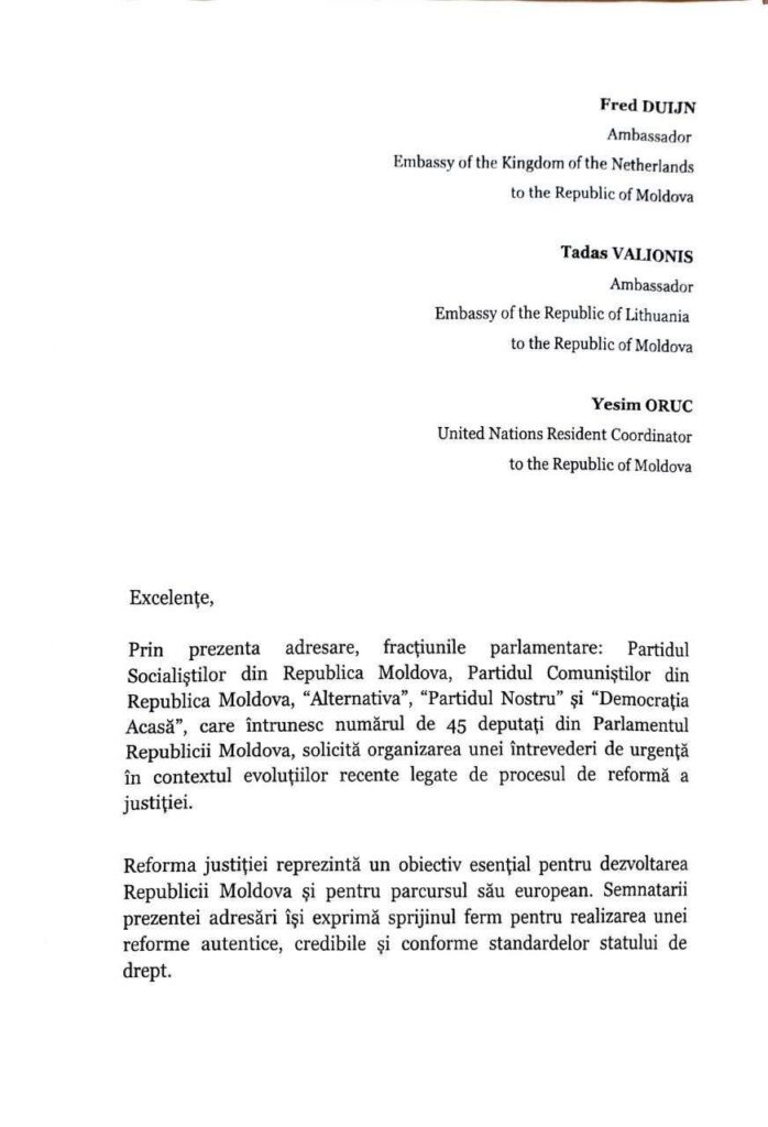 Așa cum a fost promis anterior, opoziția unită a transmis o scrisoare comună conducerii mai multor misiuni diplomatice din Moldova, inclusiv ambasadoarei UE, Iwona Piórko, și însărcinatului cu afaceri al Ambasadei SUA în Moldova, Nick Pietrowicz, cu solicitarea organizării unei întrevederi de urgență în contextul evoluțiilor recente legate de procesul de reformă a justiției.