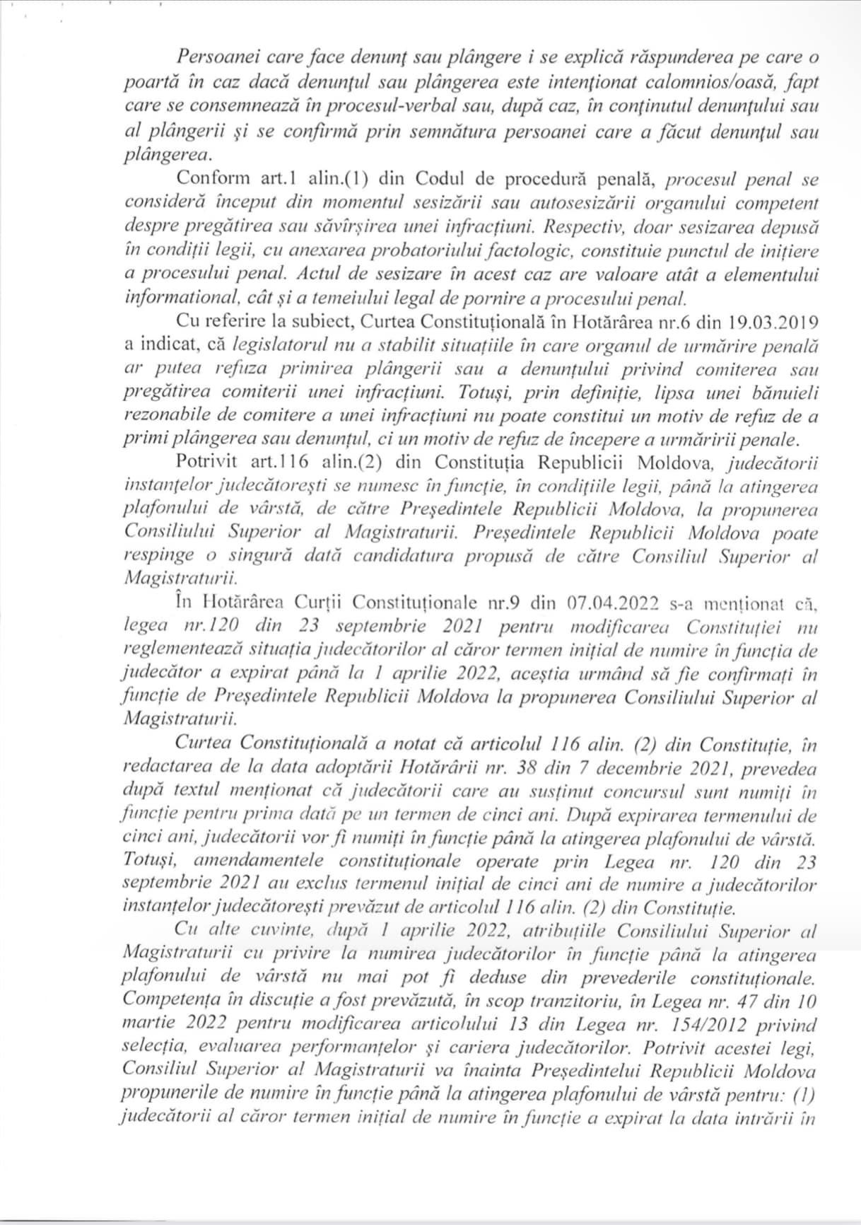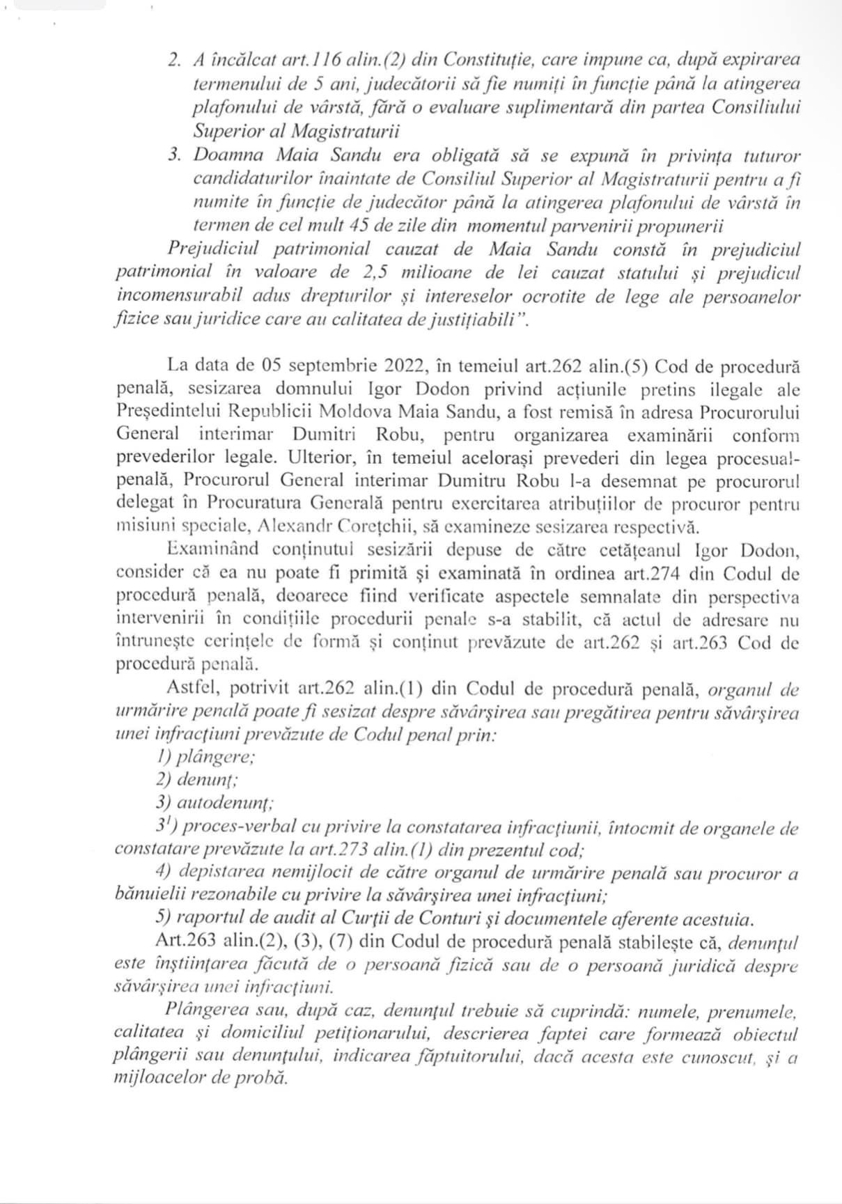 Как я уже сообщал, 1 сентября 2022 года я уведомил руководителя Антикоррупционной прокуратуры Веронику Дрэгэлин о совершении Президентом Республики Молдова Майей Санду преступления. В частности, она пренебрегла своими функциональными обязанностями и правовыми положениями о неназначении судей на должность, и, желая запугать их и подчинить себе, своими действиями президент нанесла материальный ущерб государственному бюджету в размере 2,5 млн леев, а также колоссальный ущерб правам и охраняемым законом интересам физических или юридических лиц, обладающих правоспособностью.